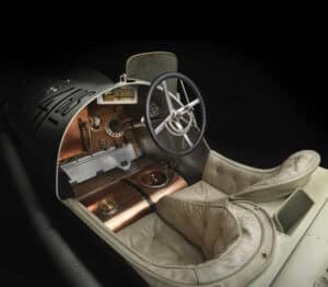 Their previous success was built on large, torquey engines. But the new rules limited capacity to 4.5 liters—compare that to the 13.5-liter engine Mercedes used at the same race in 1908! The aero division of DMG helped Daimler’s team create a new engine that would be both light and long-lasting. The result produced 105.5bhp at 3100 rpm yet weighed less than the power plants of the competition. Mercedes built six chassis for the 1914 French Grand Prix: five race entries and one spare, which is the car you see here. It was used for training and in race practice while car no. 41 received repairs, hence “41BIS,” meaning 41’s spare.